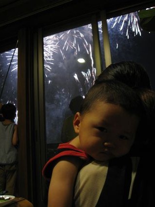 今がチャンスとばかりに、花火をバックに大好きなお母さんを独り占めだいっ!!